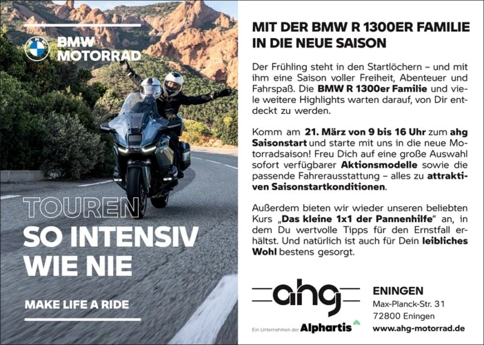 BMW MOTORRAD TOUREN SO INTENSIV WIE NIE MAKE LIFERIDE MIT DER BMW R 1300ER FAMILIE IN DIE NEUE SAISON Der Frühling steht in den Startlöchern und mit ihm eine Saison voller Freiheit, Abenteuer und Fahrspaß. Die BMW R 1300er Familie und viele weitere Highlights warten darauf, von Dir entdeckt zu werden. Komm am 21. März von 9 bis 16 Uhr zum ahg Saisonstart und starte mit uns in die neue Motorradsaison! Freu Dich auf eine große Auswahl sofort verfügbarer Aktionsmodelle sowie die passende Fahrerausstattung - alles zu attraktiven Saisonstartkonditionen. Außerdem bieten wir wieder unseren beliebten Kurs „ Das kleine 1x1 der Pannenhilfe " an, in dem Du wertvolle Tipps für den Ernstfall erhältst. Und natürlich ist auch für Dein leibliches Wohl bestens gesorgt. ang Ein Unternehmen der Alphartis ENINGEN Max - Planck - Str. 31 72800 Eningen www.ahg-motorrad.de